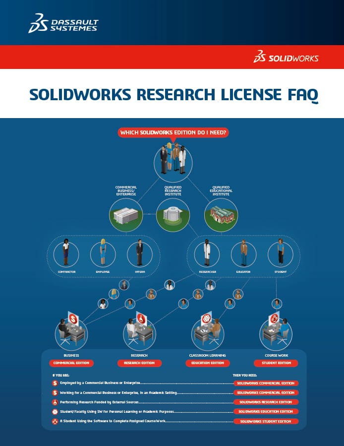Med SOLIDWORKS Academic Research licens får du som forskare tillgång till den allra senaste teknologin, kommunikation med andra forskare och industriella användare möjliggörs genom community. SOLIDWORKS Academic Research licens har inga restriktioner för användning i publikationer patentansökningar eller i projekt som samarbetar med näringslivet. Den innehåller inte den vattenstämpel som SOLIDWORKS Student Edition innehåller och följer samma releaseschema som de kommersiella SOLIDWORKS-produkterna.